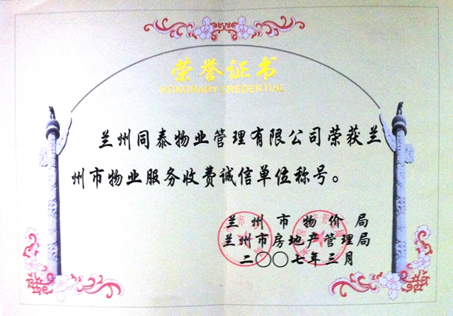 蘭州市物價局、蘭州市房地產(chǎn)管理局為我司頒發(fā)蘭州市物業(yè)服務(wù)收費誠信單位稱號榮譽(yù)證書。